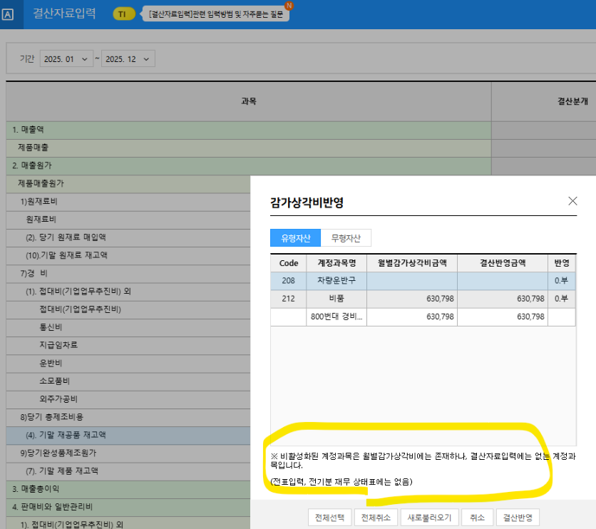 (불러오는게 오류가 납니다...500번800번대에 쪽에도 다 감가상각비계정이 잡히지 않은상태이고, 회색으로 비활성화가 되어있더라구요)