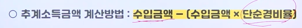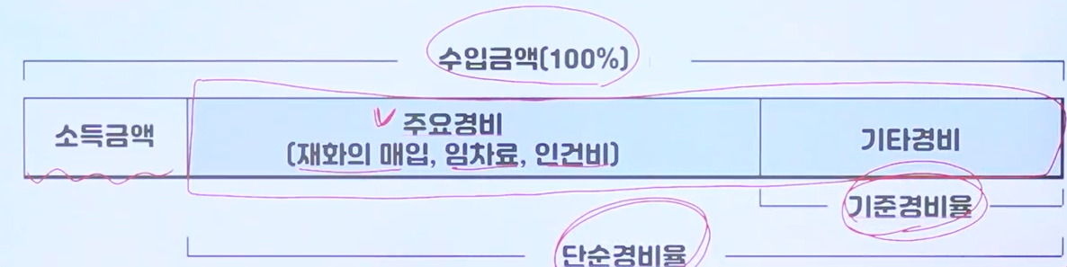 해당 사진에서는 수입금액(매출액) - 경비(주요경비+기타경비) = 소득금액,