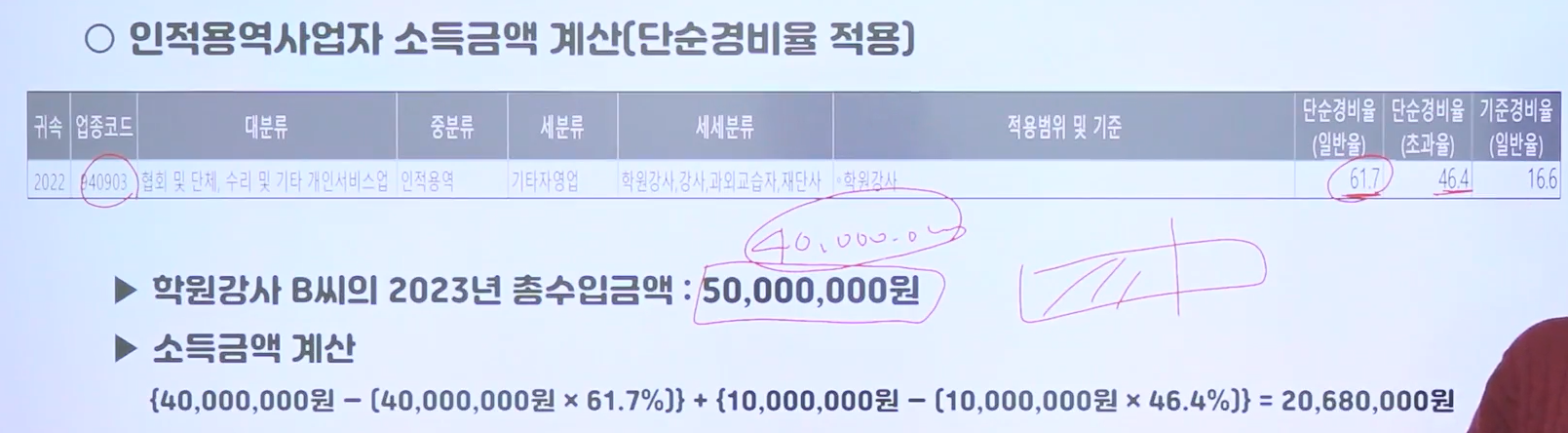해당 강의에서는 단순경비율을 적용하신게 잘 이해가 되지 않습니다.